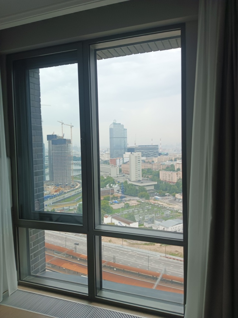Багратионовский пр. 5Ак1 квартира на 21 этаже. Через установленное застройщиком алюминиевое фасадное остекление проходит шум машин от Багратионовского проспекта и шум электричек на станции Фили, главным образом сигналы электрички. Шум в комнате при закрытых окнах на уроне 34-36 дБА.
